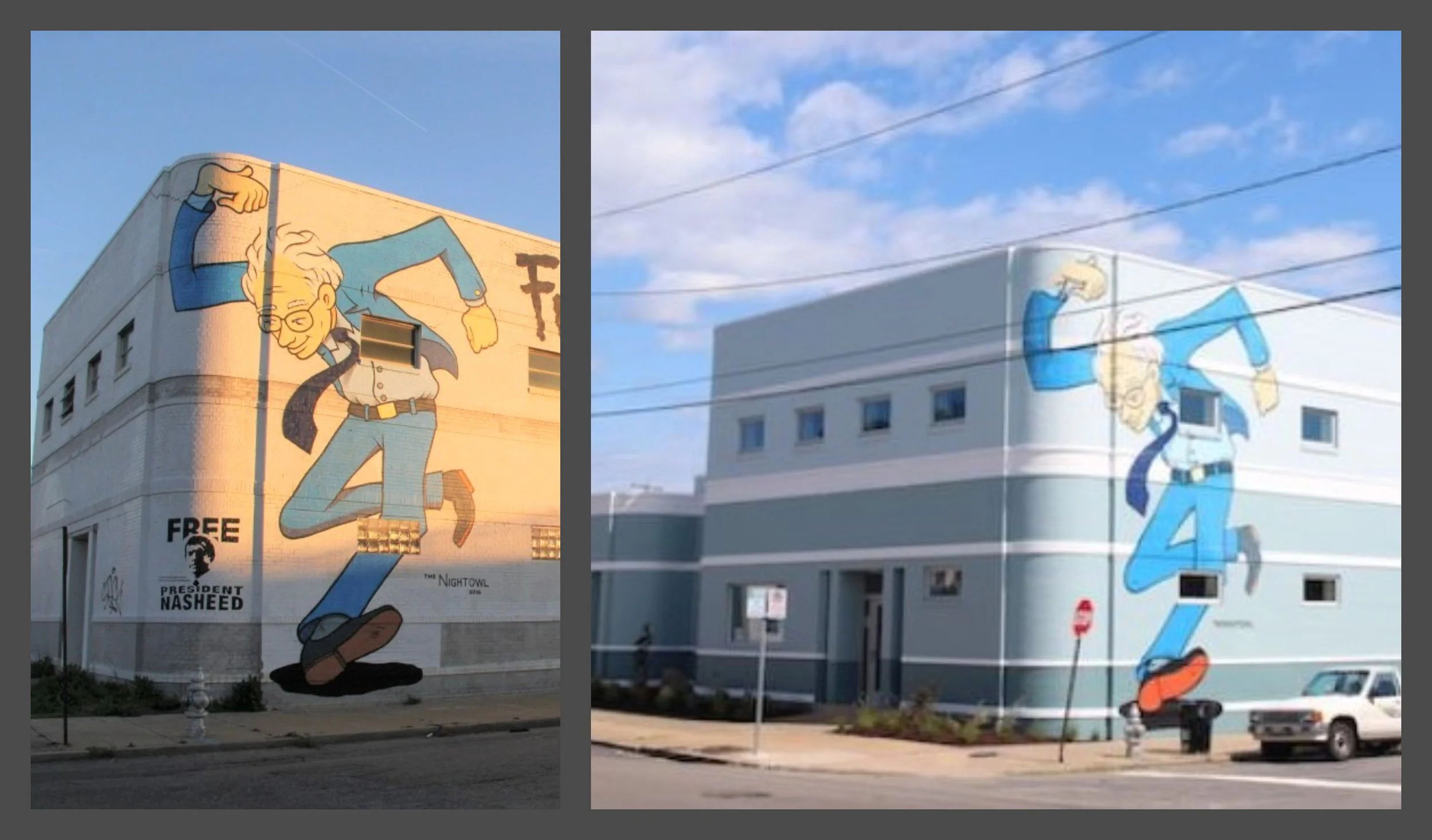 Client: Scott's Addition Historic DistrictThis project involved a comprehensive restoration of a building's exterior and its prominent street-facing mural. The work transformed the building from its original light beige color to a vibrant new color scheme, dominated by a light blue-green/teal. The central mural, depicting a running figure, was meticulously restored to revive and enhance its original colors, resulting in a significantly brighter and more visually appealing piece of public art. The restoration successfully revitalized the building's aesthetic, creating a clean, modern, and engaging facade.